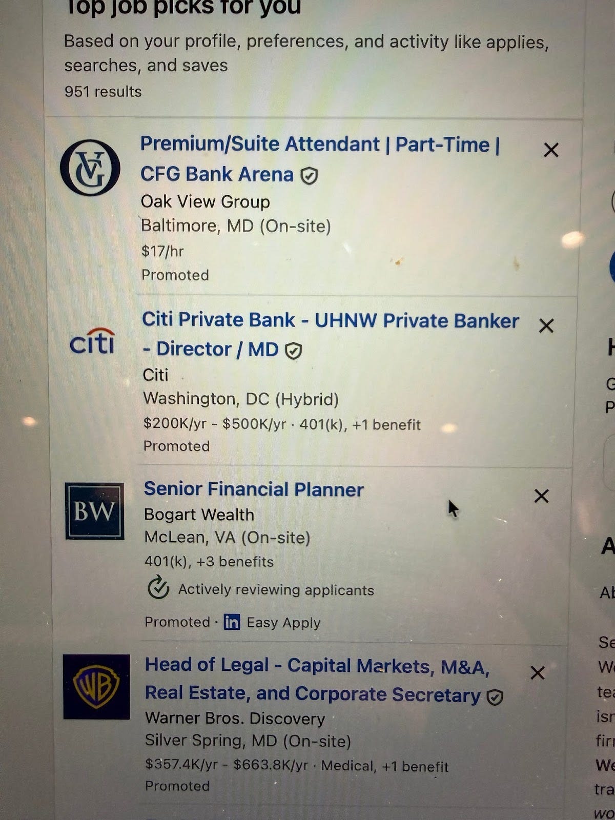 In the same recommendation feed: a suit attendant ($17/hr) and head of legal ($663k)!!
