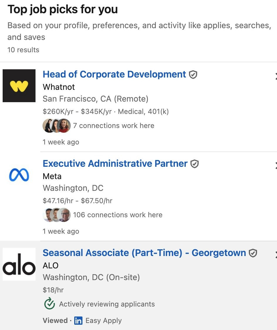 Look at those three job recommendations again. They’re completely incoherent. Sure, they’re all near DC (geographically desirable for me), but beyond that? The salary ranges are wildly divergent. The roles have nothing to do with each other. The skill sets are entirely different.